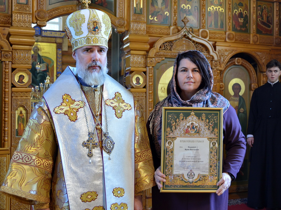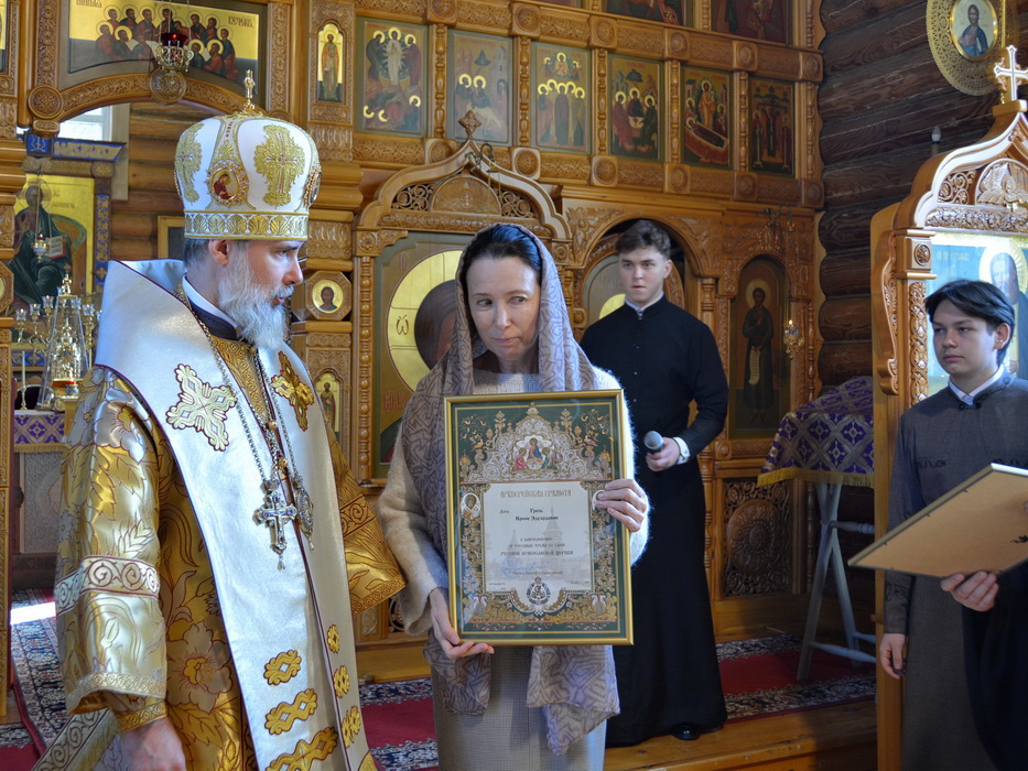 В завершение богослужения епископ Алексий обратился к прихожанам храма с архипастырским словом и вручил Архиерейские грамоты. По ходатайству настоятеля храма иерея Иоанна Гернешия наградами отмечены певчие приходского клироса Гресь Ирина Эдуардовна и Сидорова Ирина Викторовна.
