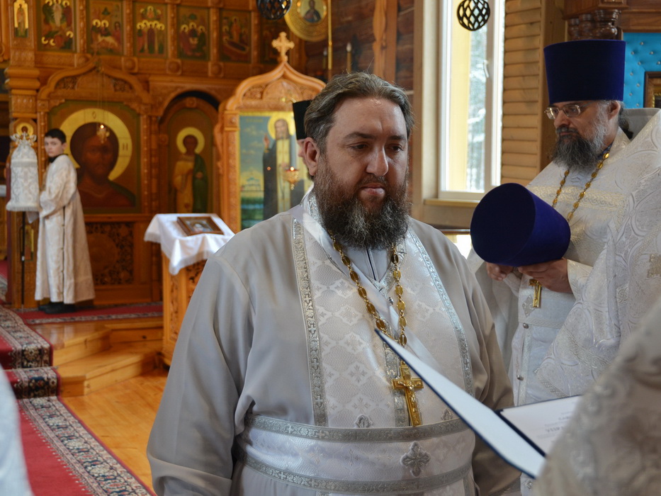 На малом входе епископ Алексий во исполнение Указа Патриарха Московского и всея Руси Кирилла наградил иерея Леонида Щербакова богослужебно-иерархические наградой – правом ношения палицы.