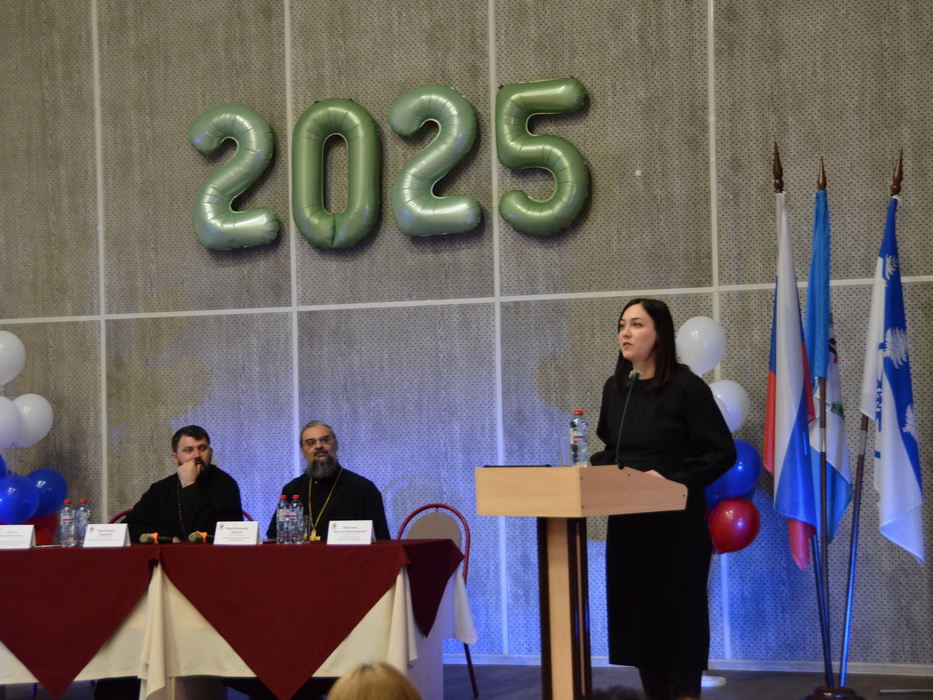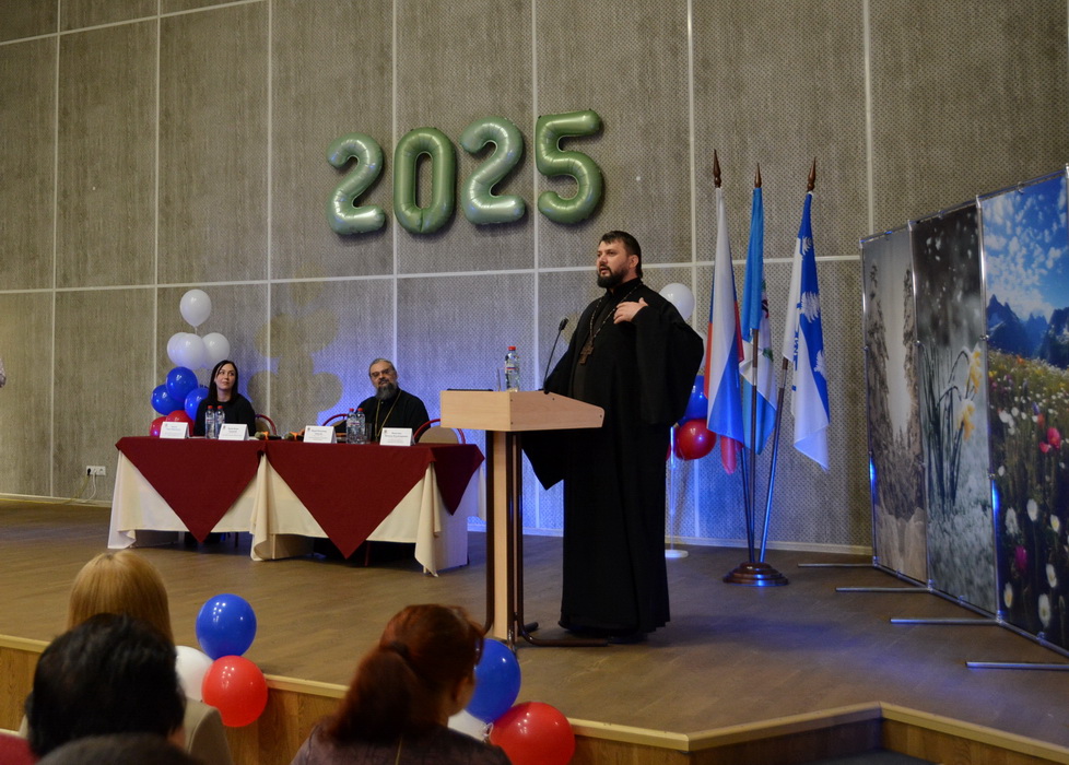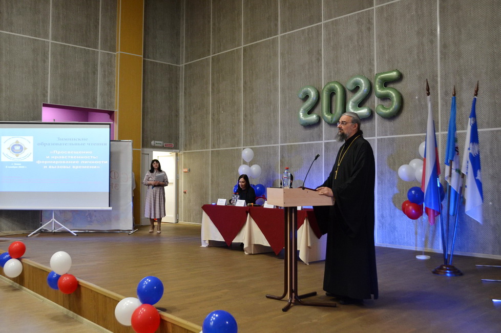 Иерей Владимир Данилко огласил Приветственный адрес епископа Саянского и Нижнеудинского Алексия. Говоря о вызовах времени, Владыка отметил, что решение связанных с глобальными вызовами проблем сопряжено с возвращением к традиционным духовным ценностям, которые на протяжении веков хранит Православие. “В наше время, когда формирование нравственного стержня личности имеет особое значение, необходимо возрождать духовную основу образования, – подчеркнул епископ Алексий. – Это означает, что воспитание нравственности подрастающего поколения должно основываться на фундаментальной для нашего Отечества православной духовной традиции”. В образовательных учреждениях приобщение детей к православной культуре может дать импульс для совершенствования системы духовно-нравственного воспитания. “Важно, чтобы дети во время учёбы образовывали не только свой ум, но и сердце; чтобы не только обогащались знаниями, но и раскрывали в себе потенциал духовного совершенства,” – сказал Владыка и пожелал всем участникам чтений благодатной помощи Божией и благословенных успехов.