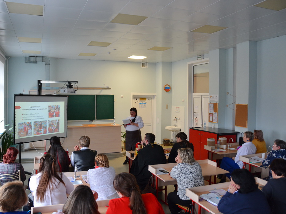 На секции «Духовно-нравственное воспитание в детском саду: опыт и перспективы» выступили 11 докладчиков – воспитателей, музыкальных руководителей, педагогов детских садов города Зимы и Зиминского района. Курировали работу секции главный специалист Комитета по образованию Зиминского городского округа Жанна Федоровна Градович, координатор отдела религиозного образования и катехизации Саянской епархии Людмила Анатольевна Невидимова, консультант по дошкольному образованию отдела религиозного образования и катехизации Саянской епархии Инесса Васильевна Марканчева. В работе секции принял участие иерей Александр Хвуст, настоятель Зиминского Свято-Никольского храма. После прослушивания докладов Л.А.Невидимова рассказала воспитателям о возможностях повышения квалификации с помощью “Клевер Лаборатории” и предложила участникам секции объединиться в сообщество по духовно-нравственному воспитанию дошкольников на основе православной культуры. Предложение о создании сообщества было поддержано воспитателями.