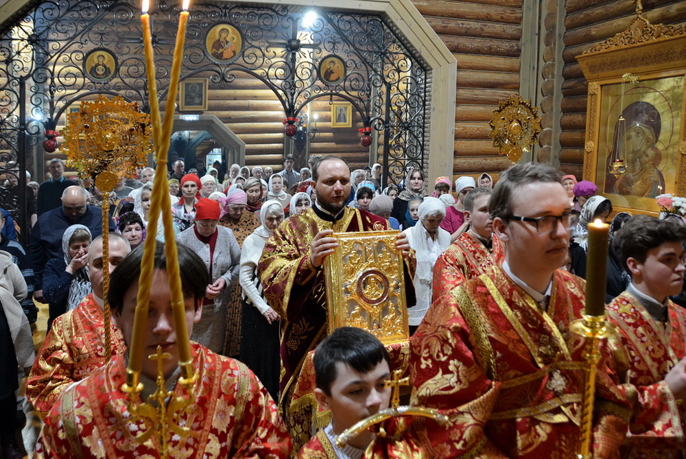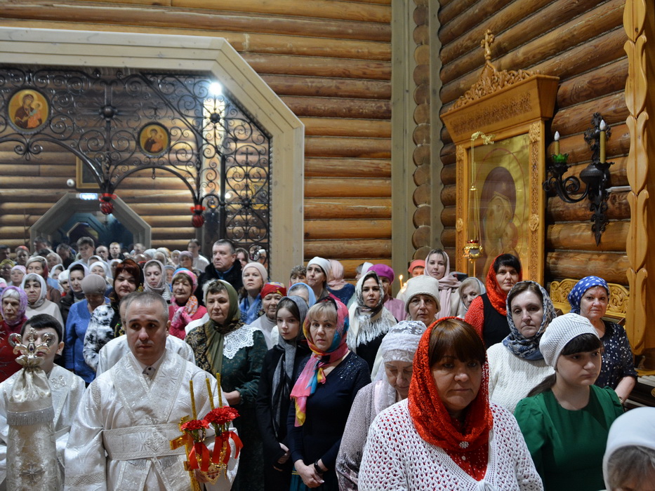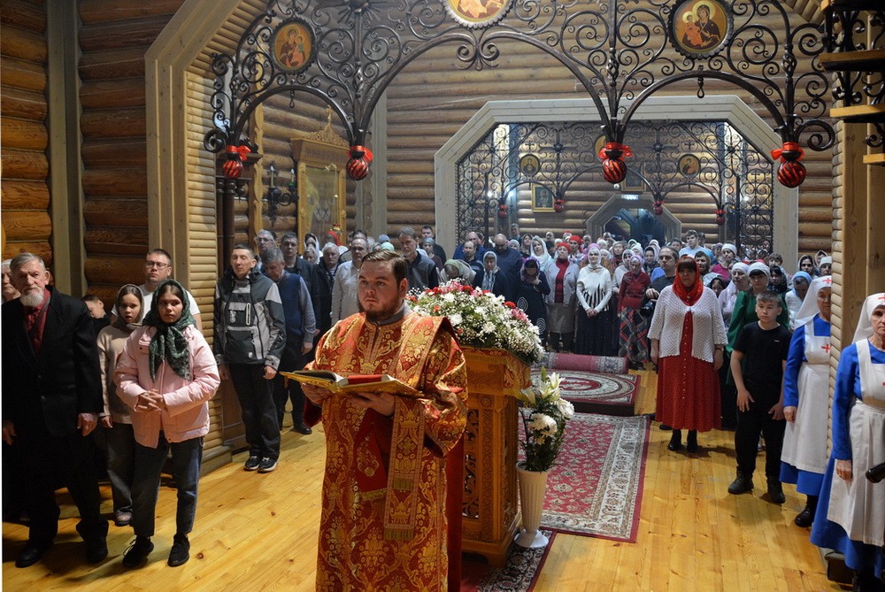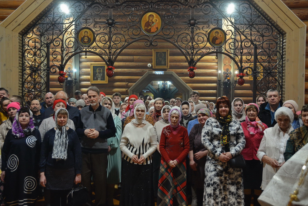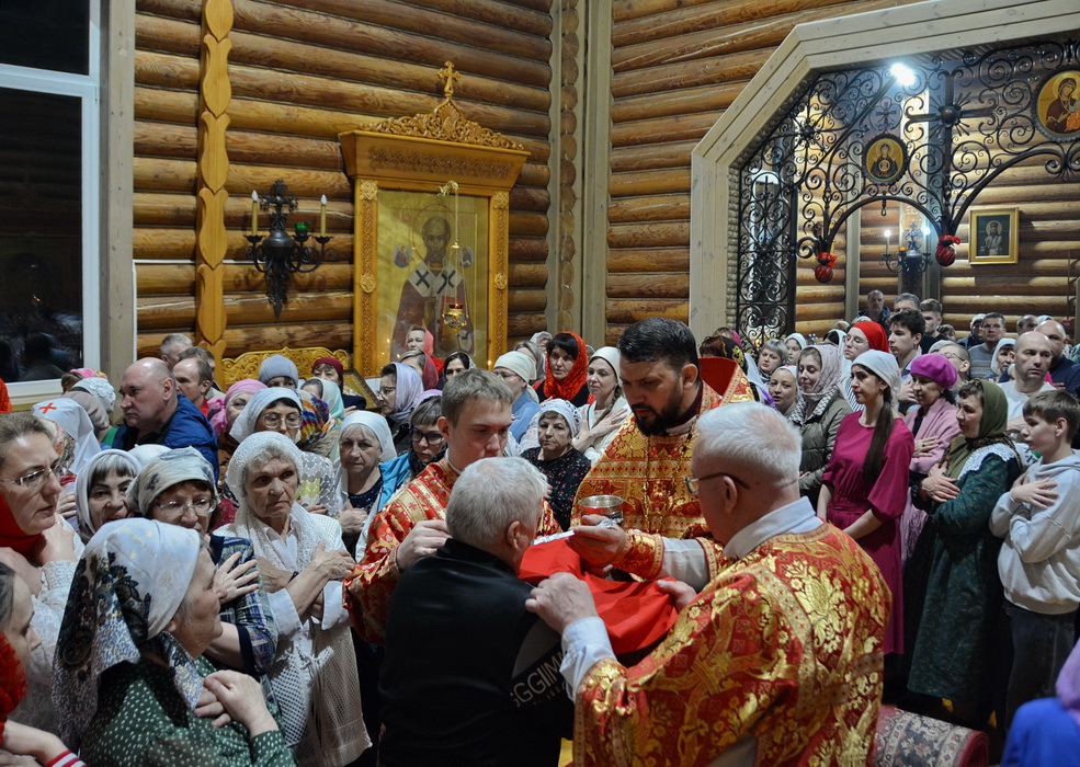 Перед причастием верующих Святых Христовых Таин иеродиакон Вениамин (Юрченко) прочитал Пасхальное послание Святейшего Патриарха Московского и всея Руси Кирилла и Пасхальное послание епископа Саянского и Нижнеудинского Алексия.
