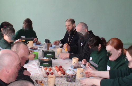 Традиционное пасхальное поздравление началось с братской трапезы для осужденных из числа хозяйственной обслуги. За праздничным столом отец Андрей возгласил пасхальное приветствие и в теплой, исполненной светлой надежды беседе священник напомнил, что Воскресение Христово — это победа жизни над смертью, любви над ненавистью, добра над злом, и что для кающегося сердца нет преград, способных отделить его от милосердия Божия.