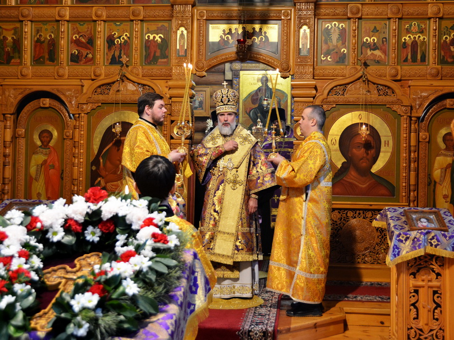 После великого славословия Крест для поклонения был вынесен из Алтаря на середину храма. Состоялось поклонение Кресту. Епископ Алексий совершил помазание верующих благословенным елеем.