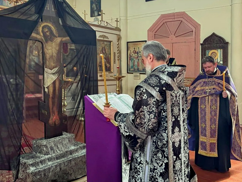 По окончании акафиста епископ Алексий прочитал Евангельское повествование о Страстях Христовых – из Евангелия от Иоанна, главы 18 и 19.